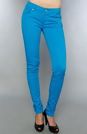 Tripp NYC The Stretch Twill Pants in Turquoise,Denim for Women: Model is wearing a size 1 From partywear extraordinaires Tripp NYC come these juicy-sweet skinnies that will amp it up wherever youre rocking it! This turquoise is like a tidal wave of radicool. Denim stretch pant with 5 pockets and zip fly; includes skull stud detail and stitched T on back pockets By Tripp NYC 0=24/25 1=25/26 3=27/28 5=28/29 7=29/30
