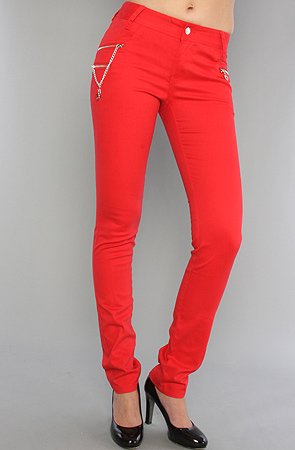 Luxirie by LRG The Lux Chain Skinny Jean in Red,Denim for Women: Model is wearing size 25. Mid-rise skinny jean with zipper detail at front and back pockets; chain accent on side; 97% cotton 3% spandex. By Luxirie by LRG