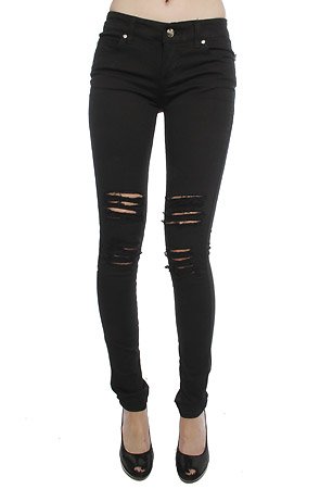 Tripp NYC The Ripped Knee Stretch Twill Pants,Denim for Women: Model is wearing a size 1 5 pocket stretch skinny leg low rise twill pant with distress ripping detail at knees; T on back pockets; zip fly; 97% cotton 3% spandex. By Tripp NYC