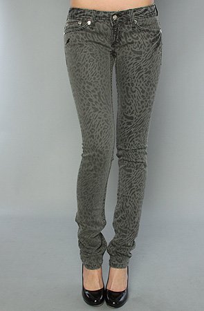 *NYC Boutique The Jett Jean in Fulton Wash,Denim for Women: Model is wearing a size 25 5 pocket stretch twill skinny jean in leopard print pattern throughout; logo stitching on back pockets and underneath front pocket; zip fly and button closure; 98% cotton 2% spandex. By AKDMKS