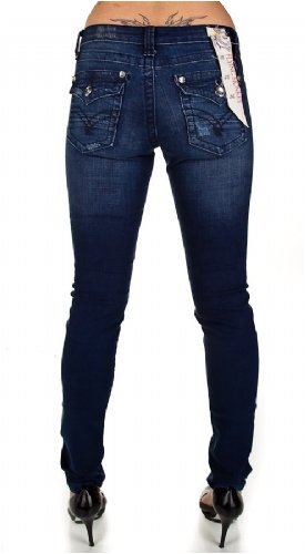 Sunset Boot Cut Jean in dark blue from Flying Monkey Jeans. New Flying Monkey for 2009. This jean has all the extras for a very flattering look. The dark wash, crystal decorative buttons, and slight fading throughout the leg makes this jean a must have for any casual occasion.